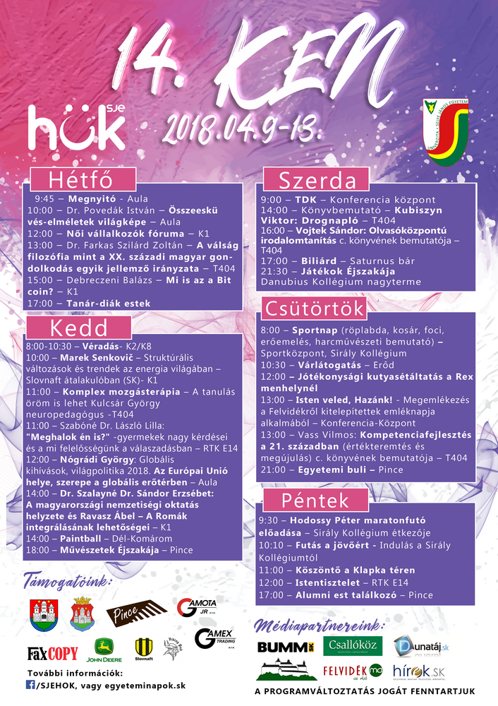 14. Komáromi Egyetemi Napok 2018. április 9-13. A szervezők színes és gazdag programkínálattal várnak minden érdeklődőt!