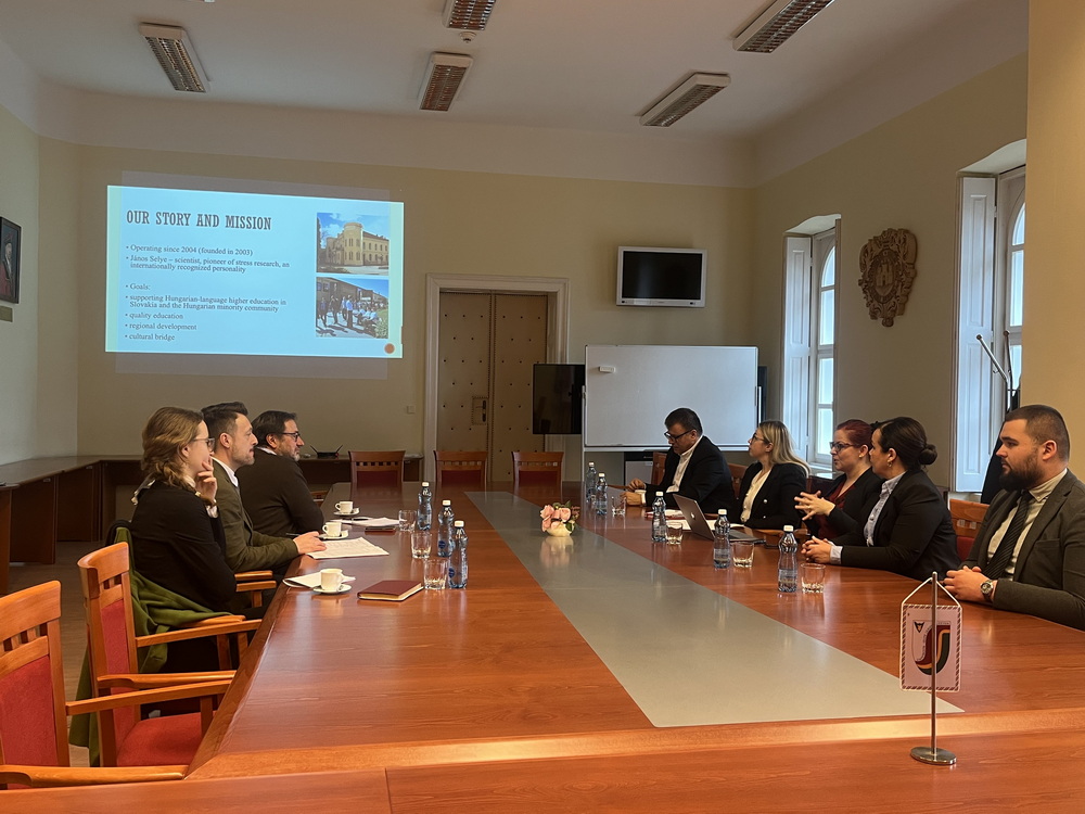 2026. január 27-én a Selye János Egyetemre látogatott doc. Thomas Perrin, PhD., a Francia Nagykövetség – Francia Intézet tudományért és egyetemi együttműködésért felelős attaséja, Francois-Olivier Seys, a University of Lille professzora és Cécile-Marie Lajambe gyakornok. A találkozó középpontjában egyetemünk és a francia felsőoktatási intézmények közötti együttműködés erősítése, hosszútávú szakmai kapcsolat kiépítése állt. A megbeszélésen szó esett közös kutatási projektek indításának lehetőségeiről, valamint nemzetközi pályázatokban való részvételről.