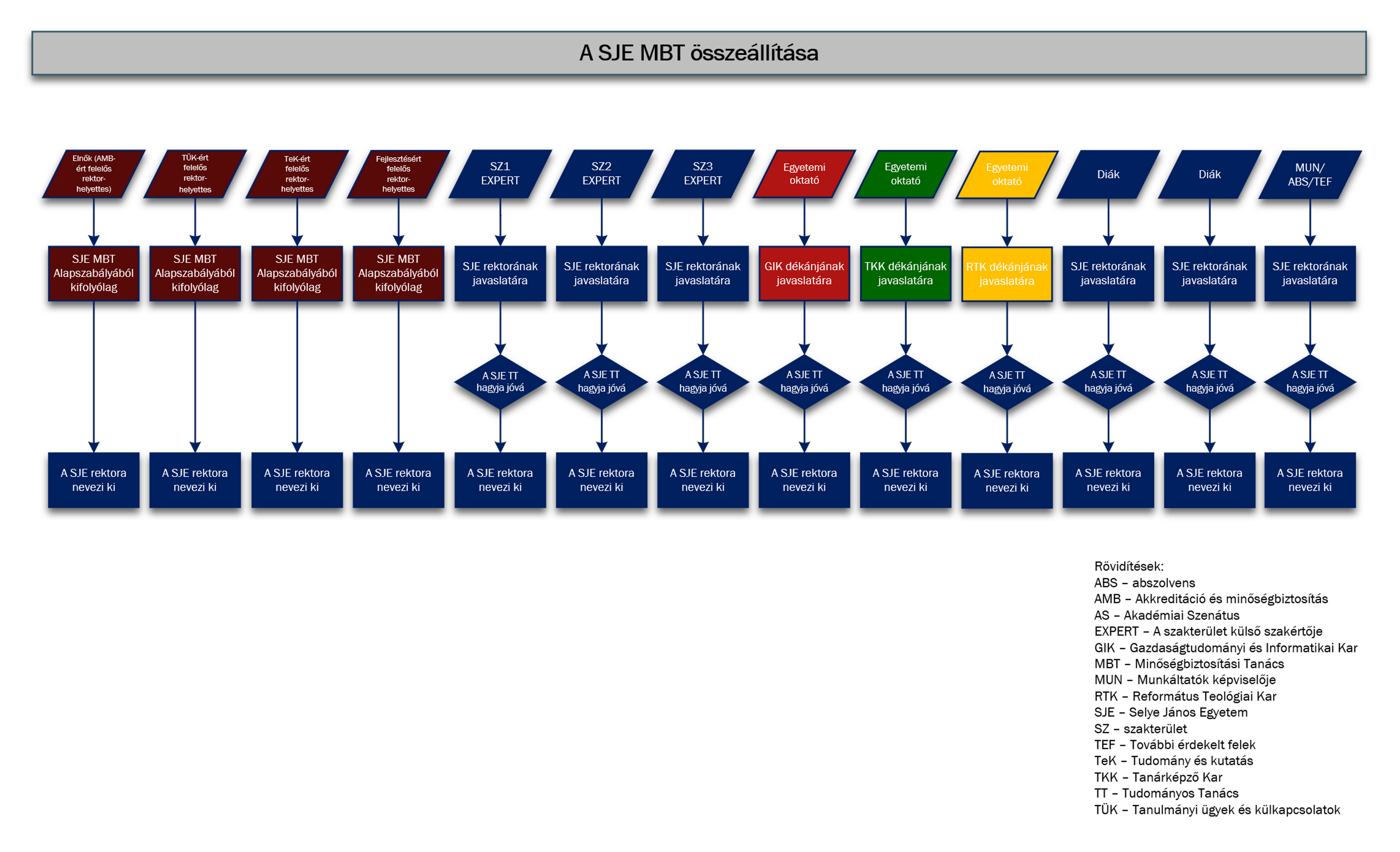 A Selye János Egyetem Minőségbiztosítási Tanácsának tagságát (a rektorhelyettesi állandó tagokon kívül) a rektor javaslata alapján a Selye János Egyetem Tudományos Tanácsa hagyja jóvá. Az egyetem rektora 2021. július 13-i hatállyal nevezte ki tisztségükbe a Selye János Egyetem Minőségbiztosítási Tanácsának tagjait. A tagok megbízatási ideje négy évre, hallgatói tagok esetén két évre szól.