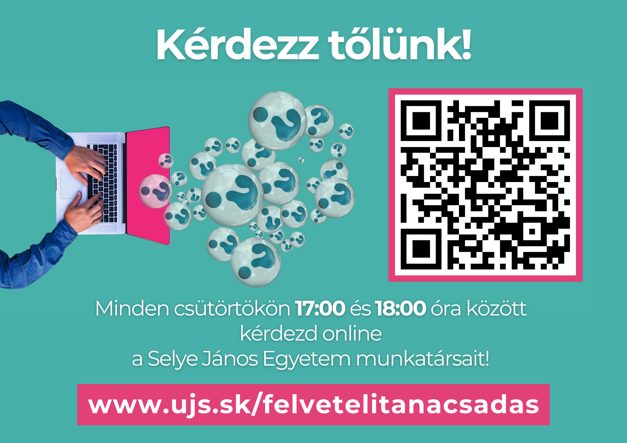Az online tanácsadáson kívül további információért keressék egyetemünk munkatársait telefonon, e-mailben vagy akár személyesen: https://felveteli.ujs.sk/elerhetosegek/