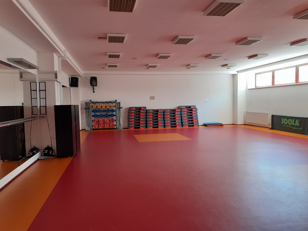 A termünkben tükrök vannak elhelyezve, hogy az itt tornázók a mozgás pontos kivitelezését is ellenőrizni tudják. Ebben a teremben van mód jó minőségű német asztalitenisz asztalokon játszani. Ezen kívül a különböző tánctípusok gyakorlására is alkalmas.