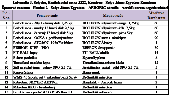 A Selye János Egyetem az Önök számára „C” típusú tantárgyként biztosít különböző aerobik jellegű sporttevékenységet. Ilyen lehet a HOT IRON, BODY ZONA, CARDIO edzés, STEPP AEROBIK, CROSS-FIT. (KTVŠ/VSA1a,b;KTVŠ/VPA1a,b;TEL2a,b;TEL3a/HI/17- KTVŠ/VSA1a,b;KTVŠ/VPA1a,b;TEL2a,b;TEL3a/BZ/17- KTVŠ/VSA1a,b;KTVŠ/VPA1a,b;TEL2a,b;TEL3a/CT/17- KTVŠ/VSA1a,b;KTVŠ/VPA1a,b;TEL2a,b;TEL3a/SA/17- KTVŠ/VSA1a,b;KTVŠ/VPA1a,b;TEL2a,b;TEL3a/CF/17 )