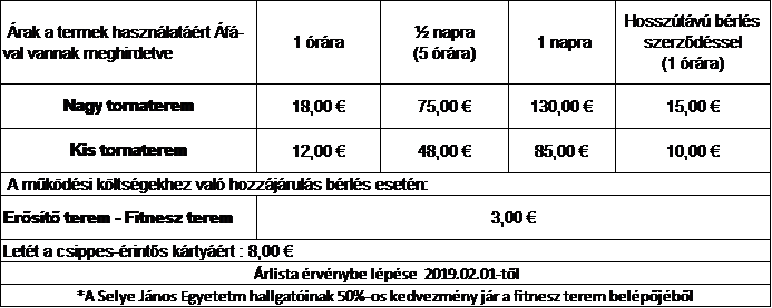 A SJE Sportközpontjának egyes termeit a nyilvánosság is használhatja a következő feltételek mellett.