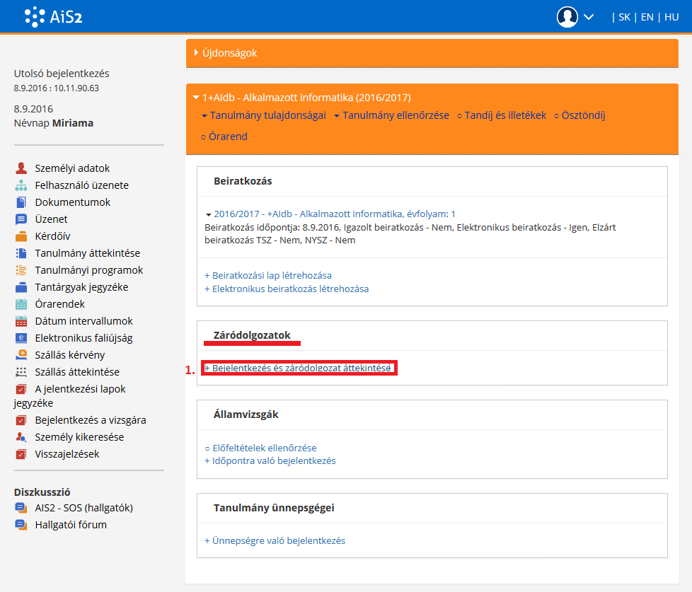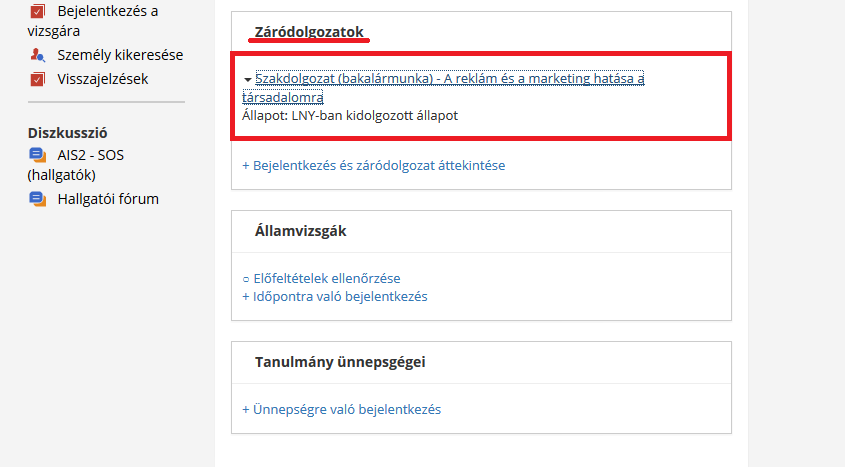 Az Ön által kiválasztott téma és annak állapota megjelenik a főoldalon a Szakdolgozat (Záverečné práce / Theses) menü alatt.