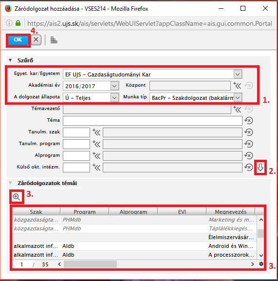 A rendszer erre kilistázza a kiírt témákat (3). A foglalt témák szürkével, dőlt betűvel vannak szedve, míg a feketével szedettek még nem foglaltak. Amennyiben további információt szeretne egy adott témáról, kattintson a további információ gombra (3). Miután választott, kérjük, kattintson az OK gombra (4).