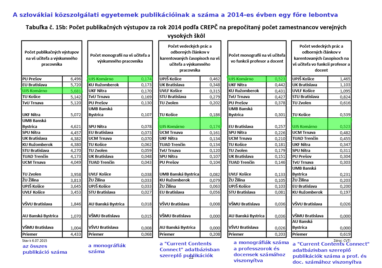 Szlovákia kormánya 2015. szeptember 23-án tárgyalta a felsőoktatás helyzetéről szóló éves jelentést. A tárgyalt dokumentumnak része a szlovákiai közszolgálati egyetemek publikációs tevékenységéről szóló kimutatás. Az egy főre kimutatott publikációs kimenetek számát figyelembe véve a SJE kiválóan teljesített, s még a 2013-as eredményekhez képest is sikerült előrelépnie.