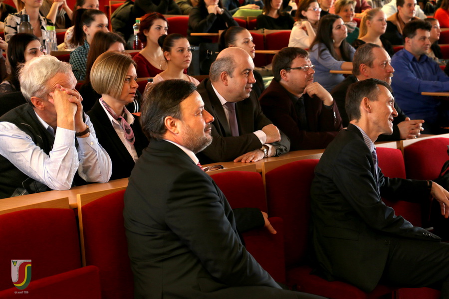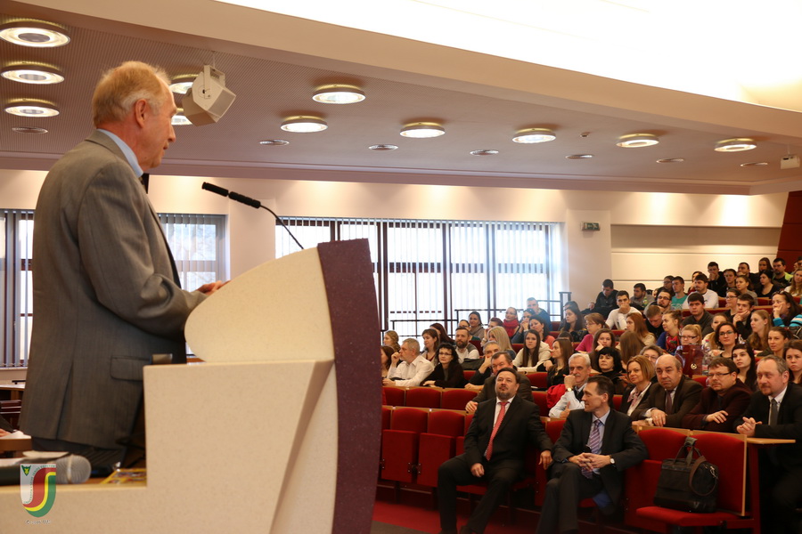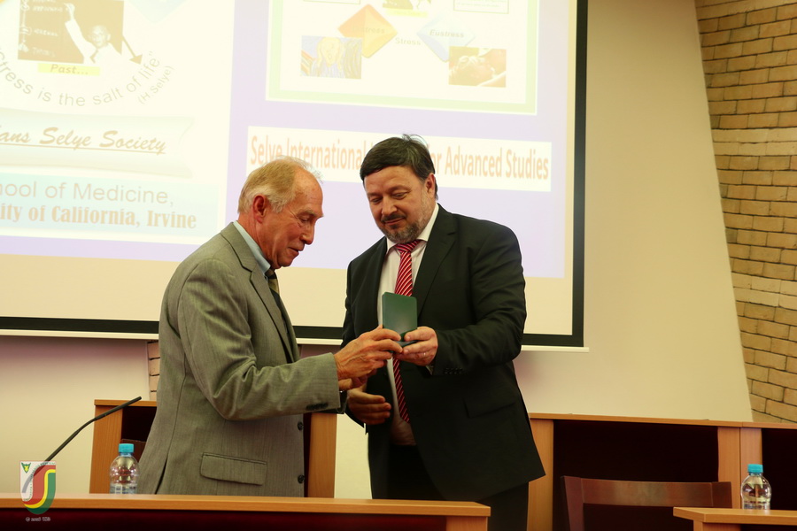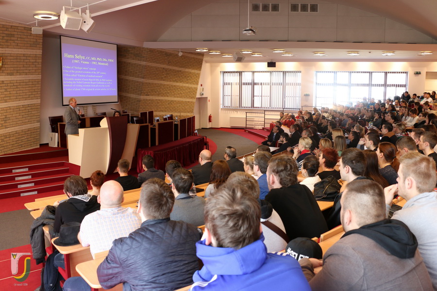 Professzor úr a Selye János munkásságát bemutató előadását a közös kutatói tevékenység során szerzett személyes tapasztalatokkal gazdagította. Rámutatott a stressz jelenségére, a distressz és eustressz közti különbségre, megismertette a hallgatókat Selye János legjelentősebb műveivel. Az előadás végén egyetemünk névadója, Selye János munkásságának népszerűsítése, hagyatékának ápolása terén kifejtett eredményes tevékenységéért egyetemünk rektora emlékérmet adományozott Dr. Szabó Sándor professzor részére. Az előadást megtisztelte jelenlétével Dr. Filakovszky János kutatóorvos, a bécsi székhelyű Quintiles nemzetközi vállalat elnöke és ügyvezető igazgatója.
