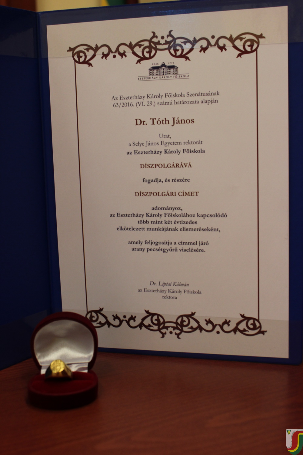 Az Eszterházy Károly Főiskola az intézmény szenátusának határozata alapján díszpolgárává fogadta és díszpolgári címet adományozott doc. RNDr. Tóth Jánosnak, PhD., a Selye János Egyetem rektorának. A rangos kitüntetést az Eszterházy Károly Főiskolához kapcsolódó több mint két évtizedes elkötelezett munkájának elismeréseként vehette át az intézmény rektorától Dr. Liptai Kálmántól. A díszpolgári elismerés feljogosítja a címmel járó arany pecsétgyűrű viselésére is. A cím átadására július 7-én, az Eszterházy Károly Főiskola egyetemmé avatásának központi díszünnepségén került sor Egerben, a központi Líceum épületében.