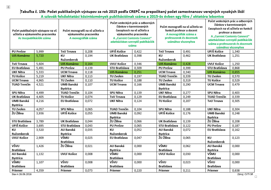 Szlovákia Kormánya 2016. szeptember 28-án tárgyalta a felsőoktatás helyzetéről szóló, 2015-ös éves jelentést. A megvitatásra benyújtott dokumentumnak része a szlovákiai közszolgálati egyetemek publikációs tevékenységéről szóló kimutatás. Az egy főre kimutatott publikációs kimenetek számát tekintve a SJE ismét kitűnőre teljesített, s még a korábbi, 2014-es eredményeket is sikerült felülmúlnia.