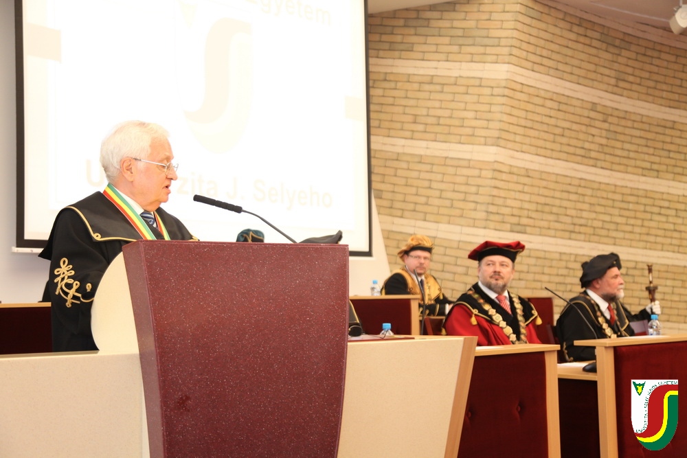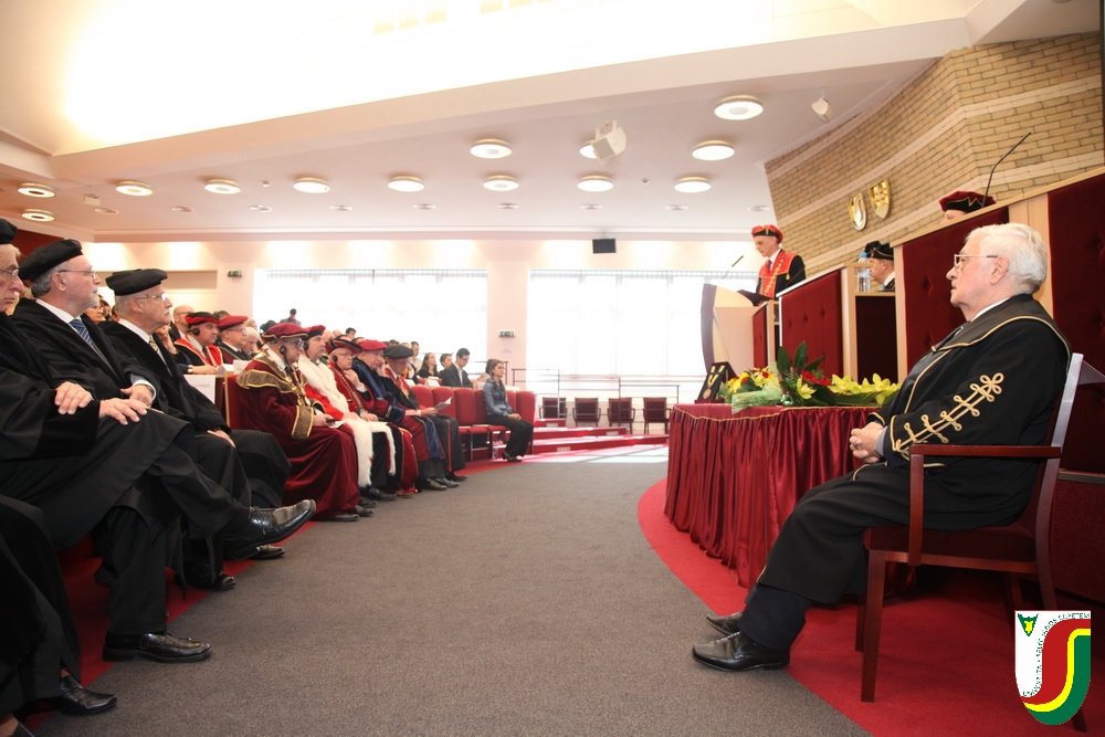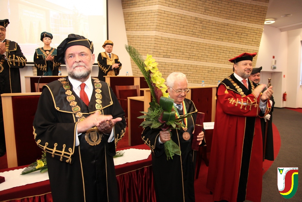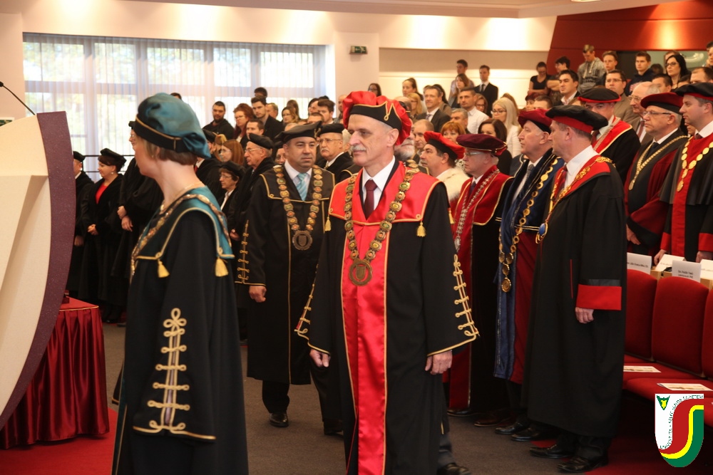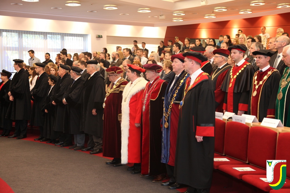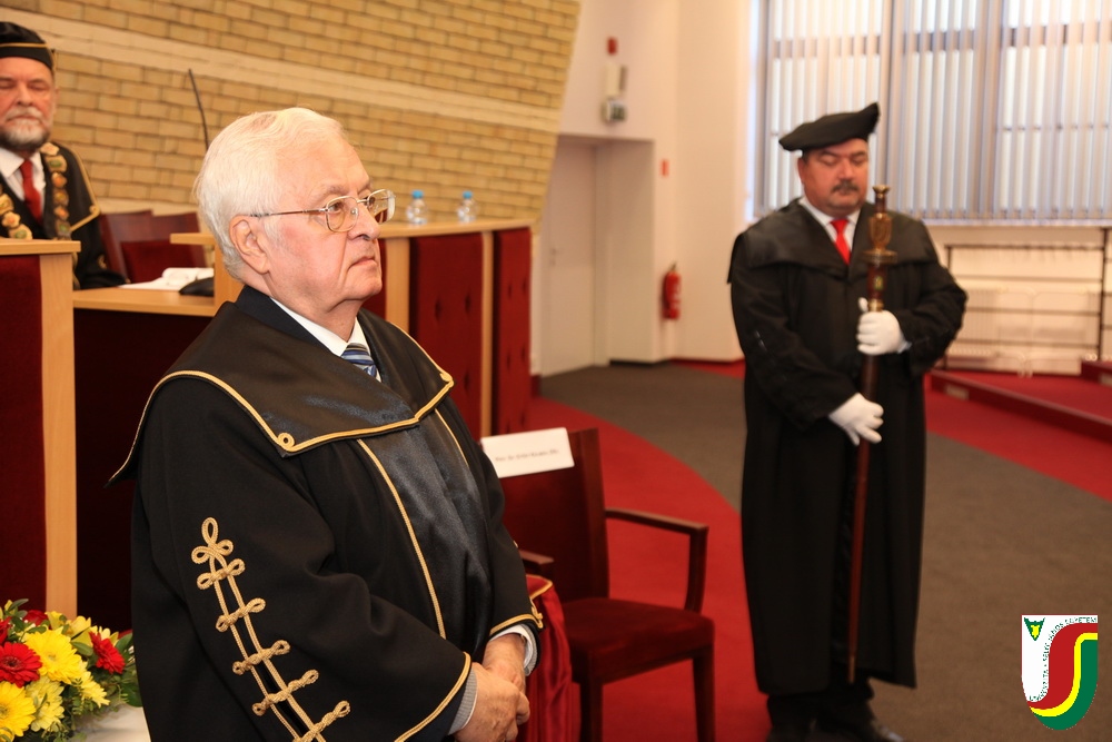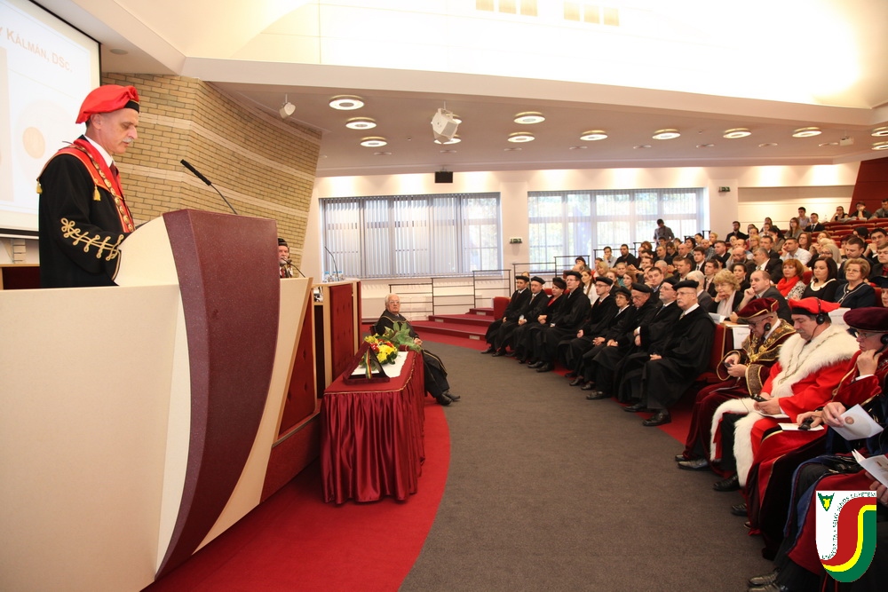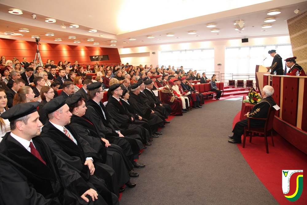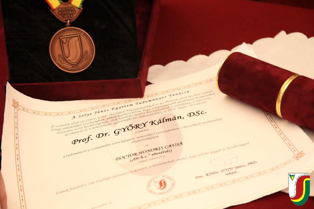 A SJE „doctor honoris causa“ kitüntető címének első birtokosa prof. Dr. Győry Kálmán, DSc., akadémikus, az Academia Europaea tagja, a Debreceni Egyetem emeritus professzora és emeritus rektora. A díszdoktori cím, melynek odaítéléséről a SJE Tudományos Tanácsa döntött a 2016. május 10-i ülésén, a jelöltnek a tudomány és a számelmélet terén kifejtett, nemzetközi viszonylatban is kiemelkedő tevékenysége elismeréseként került átadásra. Győry Kálmán elkötelezett munkásságával kiemelkedő módon hozzájárult a tudomány és a technika fejlesztéséhez, tudományos tevékenységének eredményei rendkívüli jelentőséggel bírnak hazájában és külföldön egyaránt. A díszdoktor életművét bemutató laudatio szövegét a felterjesztést benyújtó RNDr. Bukor József, PhD., a SJE Gazdaságtudományi Karának dékánja olvasta fel. A jelölt bemutatását követően a díszdoktori avatás szertartását Dr.habil. PhDr. Liszka József, PhD. rektorhelyettes végezte. Az eskütétel után a díszdoktor nyakába került a SJE lánca, majd egyetemünk rektora, doc. RNDr. Tóth János, PhD. kezéből átvette a „doctor honoris causa“ cím odaítélését igazoló oklevelet, amely viselőjét felruházza minden, e tiszteletbeli címhez kapcsolódó joggal és kiváltsággal. A díszdoktori avatást követőn intézményünk rektora köszöntötte kiváló díjazottunkat és az ünnepi közösséget. A Komáromi Kamarazenekar tagjaiból álló vonósnégyes előadását követően Győry Kálmán díszdoktor szólt az ünnepség résztvevőihez és köszönte meg a SJE által adományozott rangos elismerést.