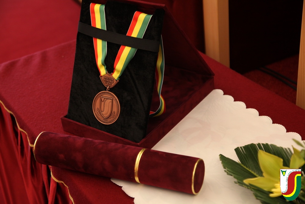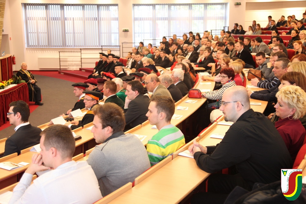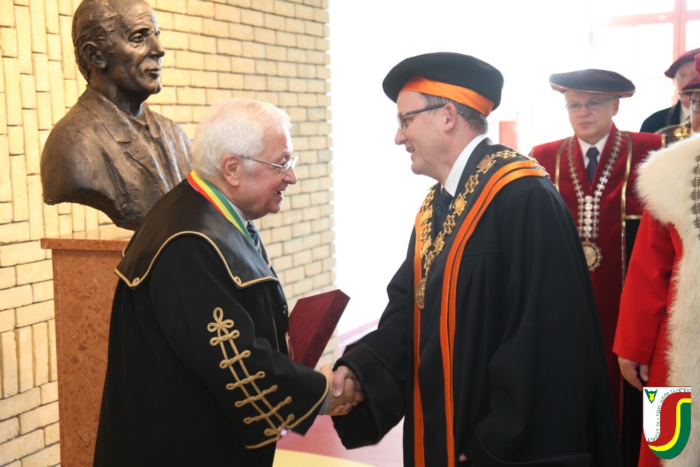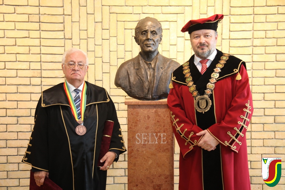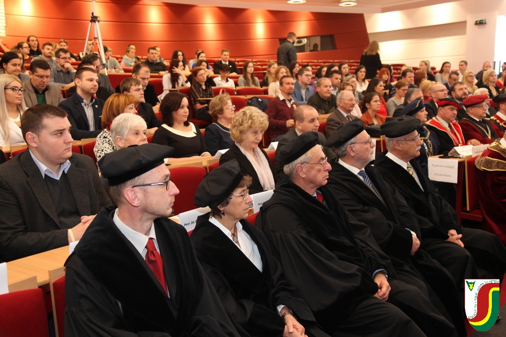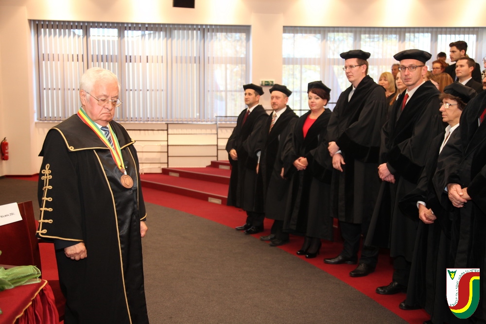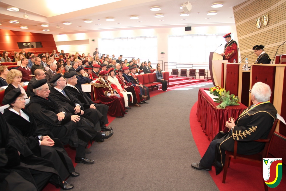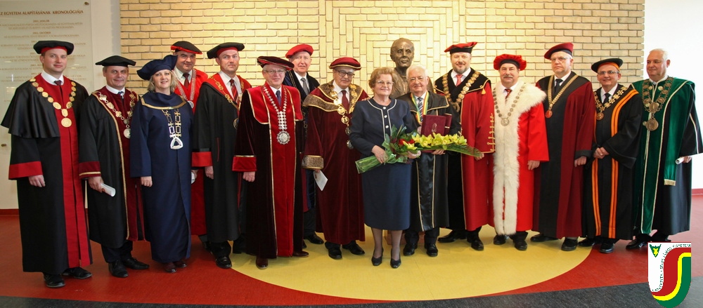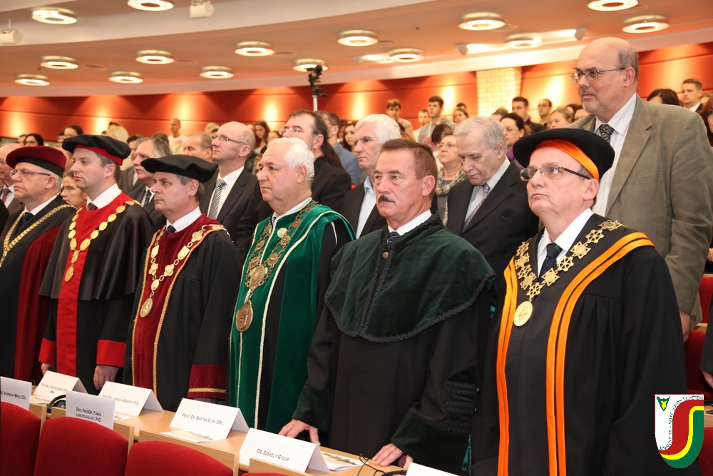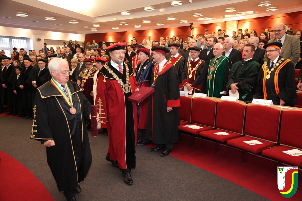 A SJE „doctor honoris causa“ kitüntető címének első birtokosa prof. Dr. Győry Kálmán, DSc., akadémikus, az Academia Europaea tagja, a Debreceni Egyetem emeritus professzora és emeritus rektora. A díszdoktori cím, melynek odaítéléséről a SJE Tudományos Tanácsa döntött a 2016. május 10-i ülésén, a jelöltnek a tudomány és a számelmélet terén kifejtett, nemzetközi viszonylatban is kiemelkedő tevékenysége elismeréseként került átadásra. Győry Kálmán elkötelezett munkásságával kiemelkedő módon hozzájárult a tudomány és a technika fejlesztéséhez, tudományos tevékenységének eredményei rendkívüli jelentőséggel bírnak hazájában és külföldön egyaránt. A díszdoktor életművét bemutató laudatio szövegét a felterjesztést benyújtó RNDr. Bukor József, PhD., a SJE Gazdaságtudományi Karának dékánja olvasta fel. A jelölt bemutatását követően a díszdoktori avatás szertartását Dr.habil. PhDr. Liszka József, PhD. rektorhelyettes végezte. Az eskütétel után a díszdoktor nyakába került a SJE lánca, majd egyetemünk rektora, doc. RNDr. Tóth János, PhD. kezéből átvette a „doctor honoris causa“ cím odaítélését igazoló oklevelet, amely viselőjét felruházza minden, e tiszteletbeli címhez kapcsolódó joggal és kiváltsággal. A díszdoktori avatást követőn intézményünk rektora köszöntötte kiváló díjazottunkat és az ünnepi közösséget. A Komáromi Kamarazenekar tagjaiból álló vonósnégyes előadását követően Győry Kálmán díszdoktor szólt az ünnepség résztvevőihez és köszönte meg a SJE által adományozott rangos elismerést.