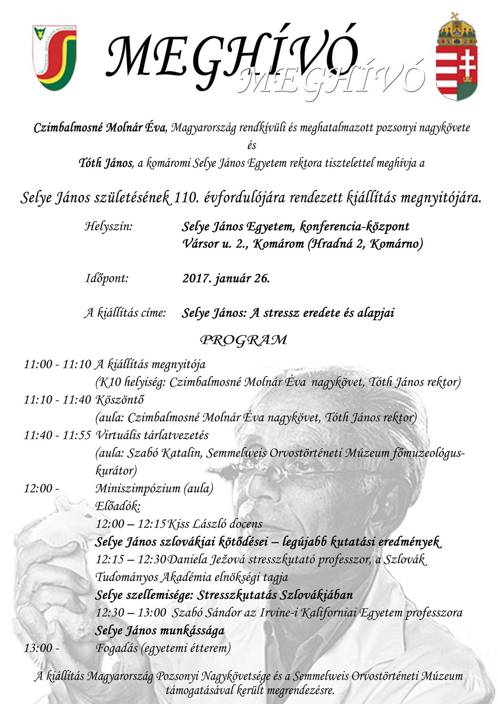 Czimbalmosné Molnár Éva, Magyarország rendkívüli és meghatalmazott pozsonyi nagykövete és Tóth János, a komáromi Selye János Egyetem rektora tisztelettel meghívja a Selye János születésének 110. évfordulójára rendezett kiállítás megnyitójára.