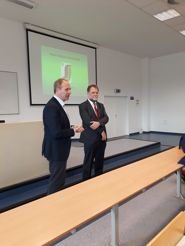 Dr. Leo Paul professzor vezetésével utrechti földrajztanárok csoportja látogatott 2017. április 26-án a Selye János Egyetemre. A közép-európai körúton lévő holland kollégák a térség kisebbségi kérdései, az egyetemi élet, illetve a nemzetközi kapcsolatrendszer iránt érdeklődtek. Dr. habil. PhDr. Liszka József, PhD., az egyetem nemzetközi kapcsolatkért felelős rektorhelyettese a konferencia-központban fogadta a vendégeket és tájékoztatta őket a szlovákiai magyar kisebbség helyzetéről, az egyetemünkön zajló képzésekről, illetve intézményünk nemzetközi kapcsolatairól. A holland földrajztanárok csoportja végül megtekintette a Selye János: A stressz eredete és alapjai című állandó kiállítást és az Egyetemi Könyvtárat is. Utóbbiról a könyvtár munkatársa, Zahoranová Alena nyújtott rövid tájékoztatást.