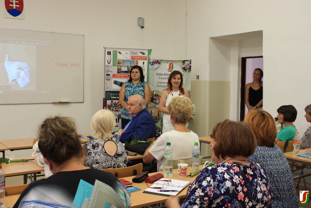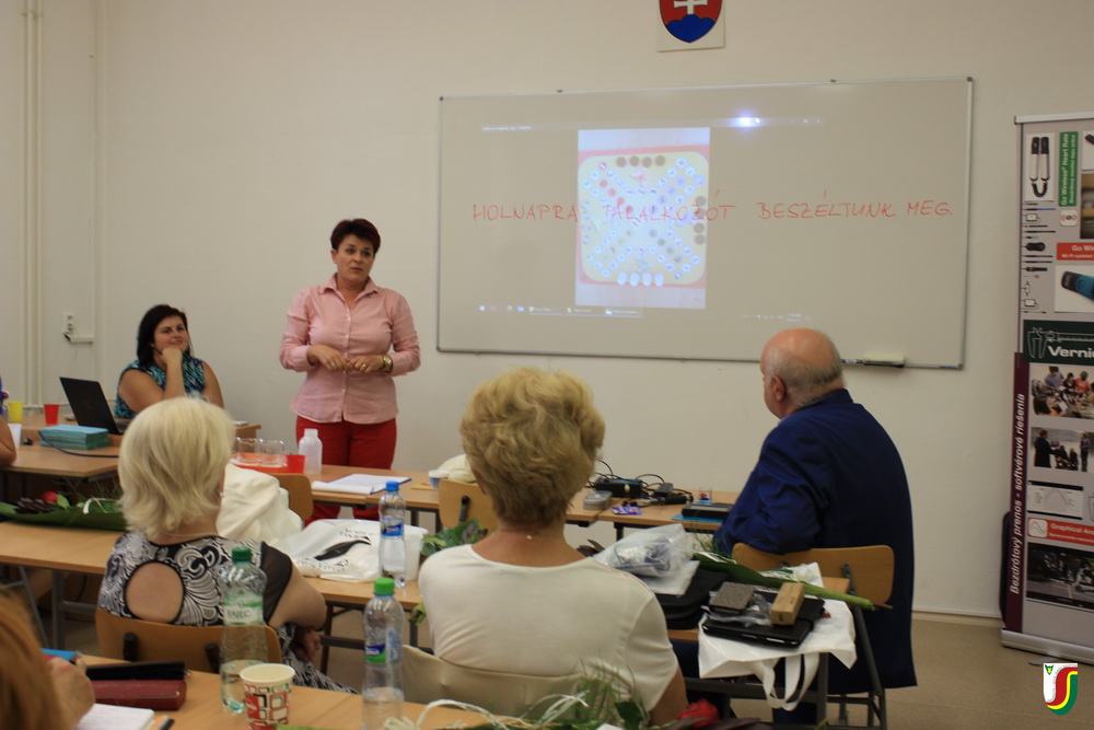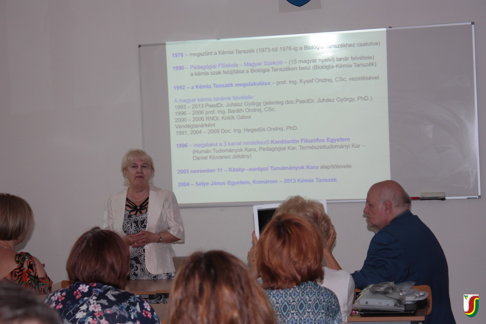 A módszertani napra meghívott vendégeink közül kiemelném Hegedűs Erzsébet, a nyitrai Mezőgazdasági Egyetem professzorának előadását, aki visszatekintésével a múltba rámutatott a felvidéki magyar kémiatanár-képzés több mint 20 éven tartó folyamatosan a fennmaradásért folytatott küzdelmeire és a sikereire, ami a kinevelt sikeres kémiatanárok számában is megmutatkozott. Ugyanakkor a 2012-es nyitrai magyar kémiatanár-képzés sajnálatos megszűnésével kapcsolatban egyben kifejezte reményét és pozitív előrelátását a szak fennmaradása tekintetében a 2012-ben a Selye János Egyetem Tanárképző Karán Kémia Tanszék megalapításával. A rendezvény másik rangos előadójaként körünkben üdvözölhettük Beáta Brestenská docens asszonyt, aki a Comenius Egyetem Természettudományi Karán működő Természettudományok Módszertana, Pszichológia és Pedagógia Tanszékének oktatója. Előadásában a felfedezésen alapuló oktatási koncepció és a mobil technológiák integrálását mutatta be, amely lehetővé teszi az irányított kognitív gondolkodási műveletek fejlesztését és monitorozását.
