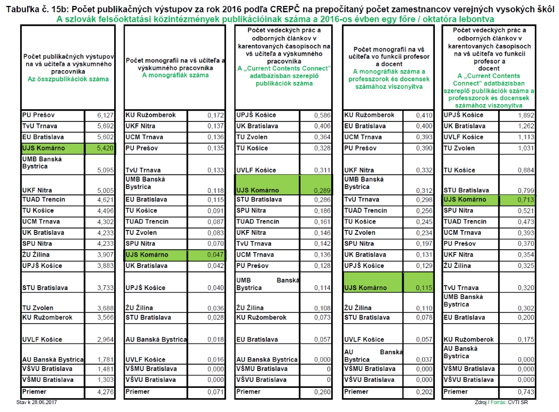 A szlovák Kormány 2017. október 4-én tárgyalta az Oktatásügyi Minisztérium által beterjesztett, a felsőoktatás helyzetét elemző 2016-os éves beszámolót. A komplex dokumentum része a felsőoktatási közintézmények publikációs tevékenységét bemutató összefoglaló, amely alapján egyetemünk az idén is kiválóan teljesített. Az egy oktatóra/kutatóra kimutatott összpublikációk kategóriájában a SJE a 20 felsőoktatási intézmény közül a 4. helyen végzett, a „Current Contents Connect” adatbázisban megjelent kimenetek számát tekintve a 6. helyet szerezte meg, míg az ugyanezen adatbázisban közölt, professzori és docensi helyekre átszámolt publikációk kategóriájában a 7. helyet sikerült megszereznie.