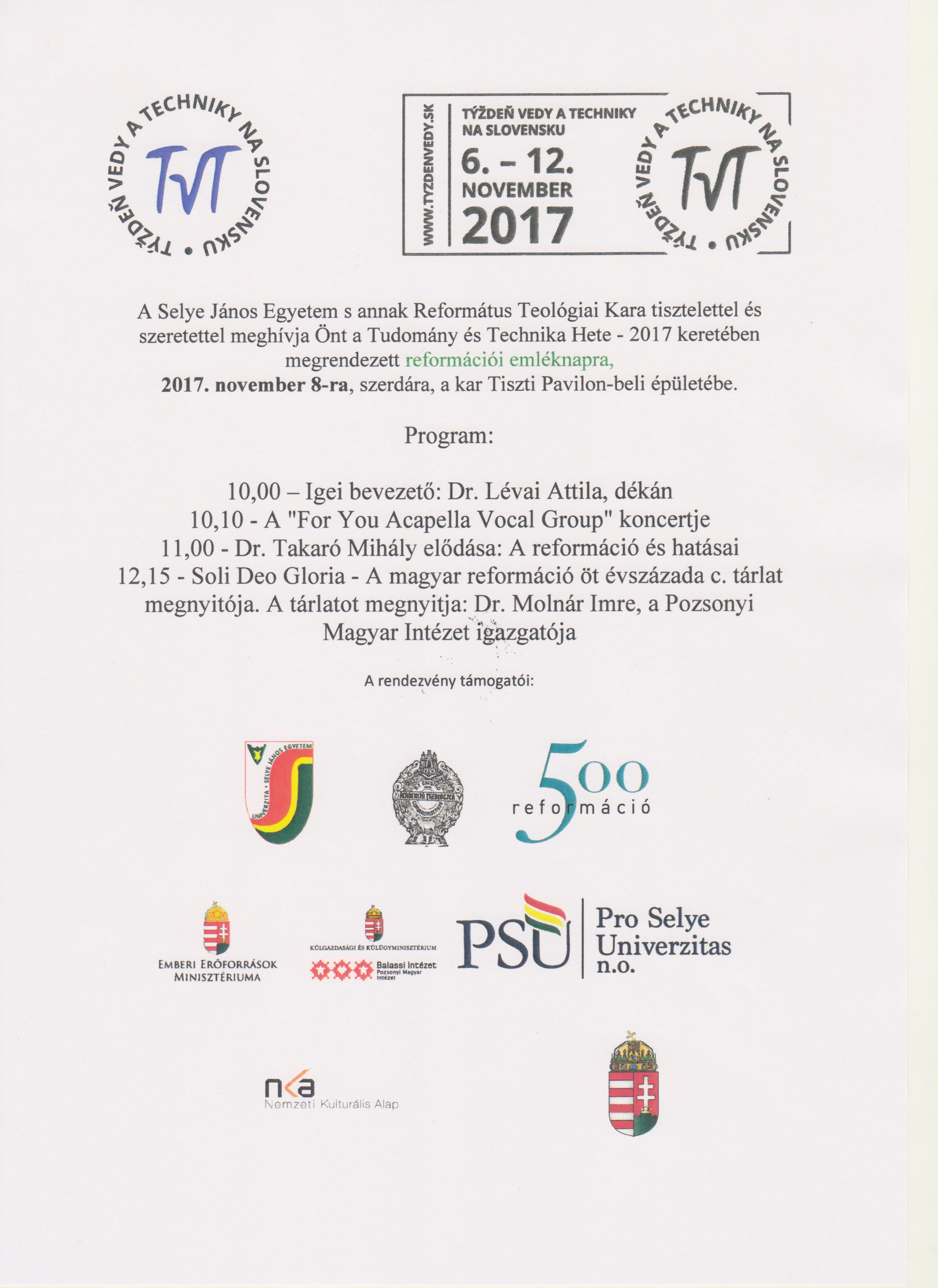 A Selye János Egyetem Református Teológia Karán 2017. november 8-án "Reformációi emléknap " címmel kerül sor arra a rendezvényre, mely a Tudomány és Technika Hete - 2017 rendezvény-sorozat keretében az 500 éves reformációnak állít emléket. Bővebb információ és a rendezvény programja a csatolt meghívóban olvasható.