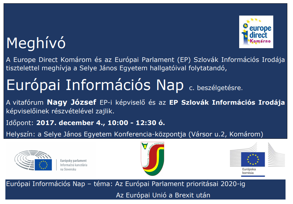A Europe Direct Komárom és az Európai Parlament (EP) Szlovák Információs Irodája tisztelettel meghívja a Selye János Egyetem hallgatóival folytatandó,