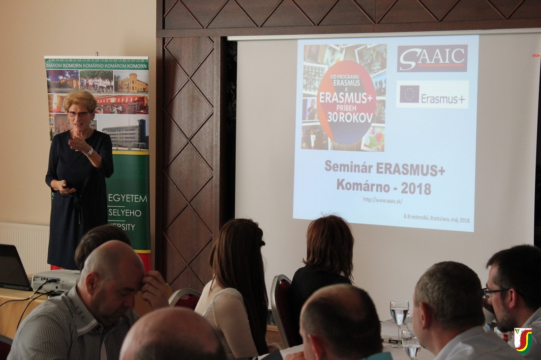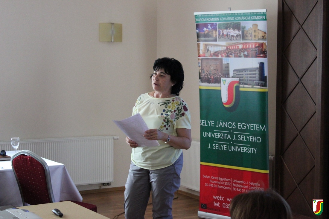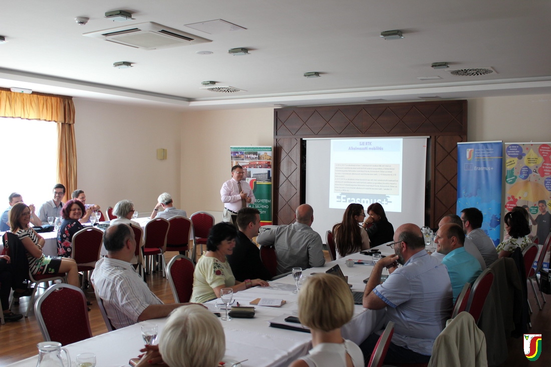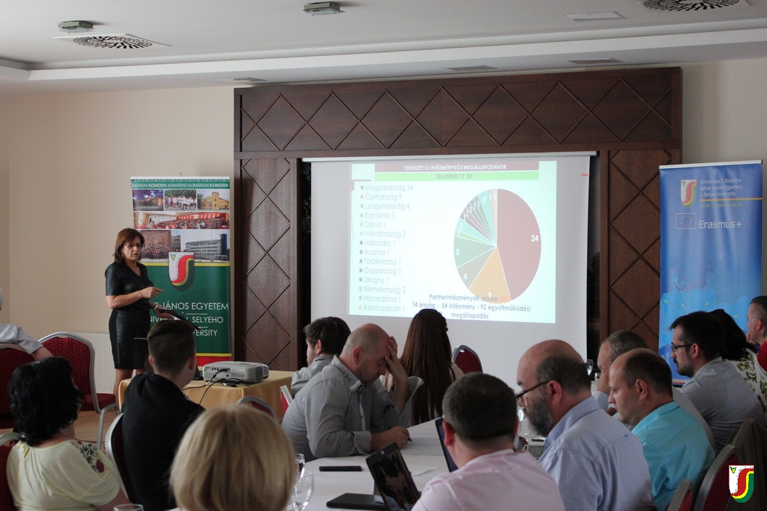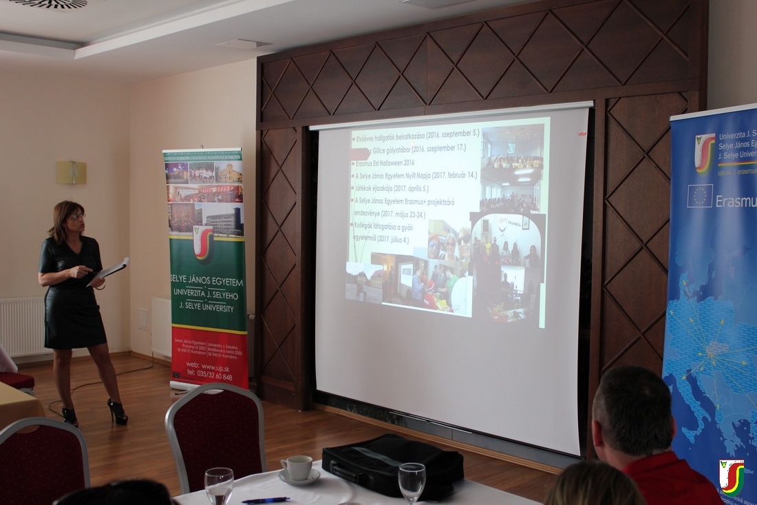 Az összejövetelt a Selye János Egyetem rektorának, Dr. habil. PaedDr. Juhász György, PhD. köszöntője nyitotta, amelyben a rektor úr kiemelte a diák és alkalmazotti mobilitások, valamint a nemzetközi kapcsolatok ápolásának és kiszélesítésének a fontosságát. Ezt követően az Erasmus+ programmal kapcsolatos időszerű tudnivalókról, az egyetemi mobilitásokkal kapcsolatos tapasztalatokról és víziókról, doc. RNDr. Beáta Brestenská, PhD., a SAAIC társulás igazgatótanácsa elnökének előadását hallgathatták meg a jelenlévők. Ezt követően Dr. habil. PhDr. Liszka József, PhD., a Selye János Egyetem nemzetközi kapcsolatokért felelős rektorhelyettese a diákmobilitások történeti és kultúrtörténeti hátteréről, azok jelentőségéről beszélt, majd Mgr. Kinczer Adriana, az egyetem intézményi Erasmus+ koordinátora a most záruló projekt megvalósításáról, annak szakmai és pénzügyi elszámolásáról, továbbá eredményeiről nyújtott összegző áttekintést. Ezután következtek a kari szintű beszámolók, amelyeket az illetékes Erasmus+ koordinátorok, Dr. habil. Ing. Machová Renáta, PhD., PaedDr. Nagy Melinda, PhD. és Mgr. Lévai Attila, PhD. adtak elő.