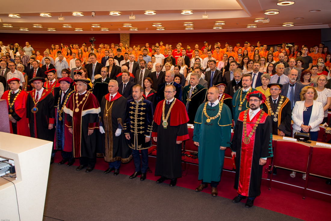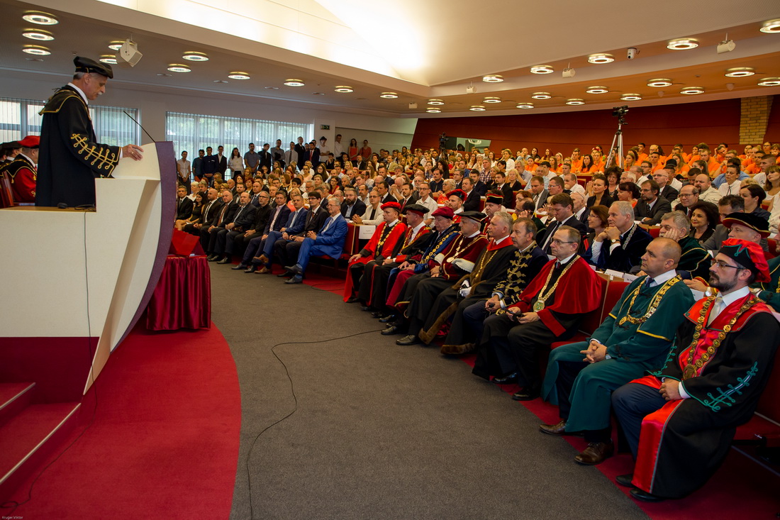 Juhász György rektor tanévnyitó beszédében ismertette az elmúlt időszak legfontosabb történéseit, rendezvényeit. A rektori beszámoló hagyományosan érintette az aktuális hallgatói létszámokat, az elmúlt évben megvalósult fejlesztéseket, bővítéseket, végül rövid útravalóval látta el az egyetem elsőéves hallgatóit. Az elhangzott beszéd teljes terjedelmében itt olvasható.