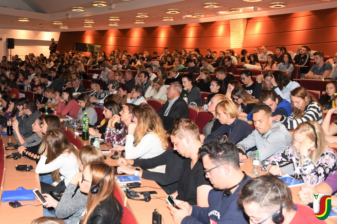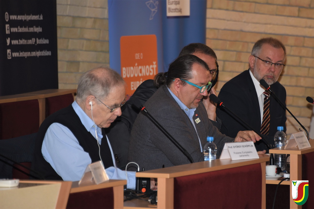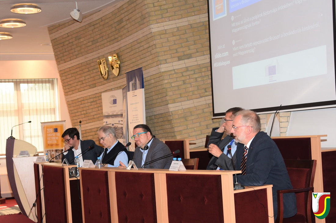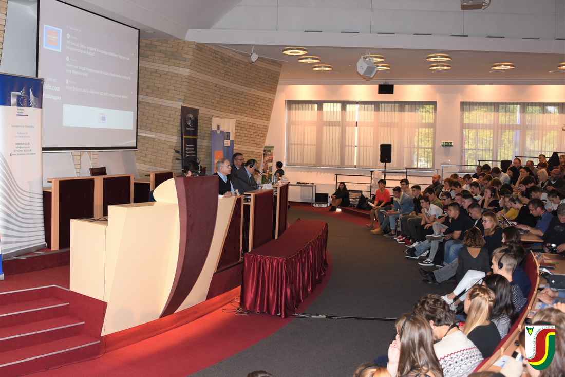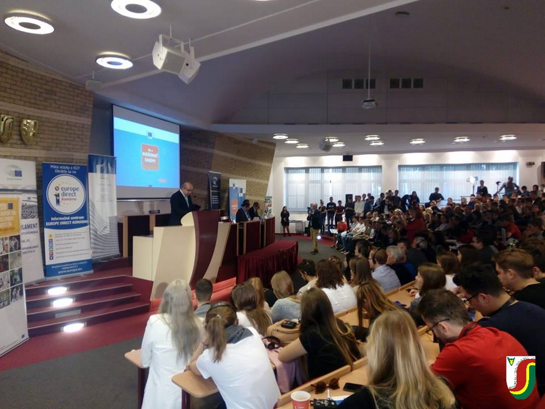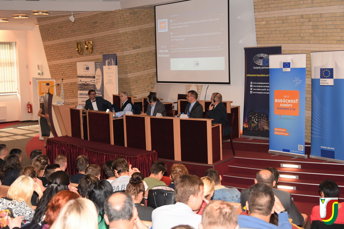 Zsúfolásig megtelt nézőtér előtt, több mint 350 érdeklődő fiatal részvételével zajlott 2018. október 8-án egyetemünkön az Európai Parlament (EP), az Európai Bizottság (EB) és az Europe Direct komáromi irodája által szervezett Európa és mi elnevezésű beszélgetés, melynek fő témája az Európai Unió alakulása és jövője volt. A rendezvényen, amelyet intézményünk rektora, Juhász György nyitott meg, Schöpflin György és Branislav Škripek EP-i képviselők, valamint Zupkó Gábor és Ladislav Miko, az EB magyarországi és szlovákiai képviseletének vezetői beszélgettek egyetemi hallgatókkal és a környező középiskolák diákjaival. A nagy sikernek örvendő, ifjúságot megszólító párbeszéd interaktív módon, a Sli.do alkalmazás segítségével, szlovák és magyar nyelven zajlott.