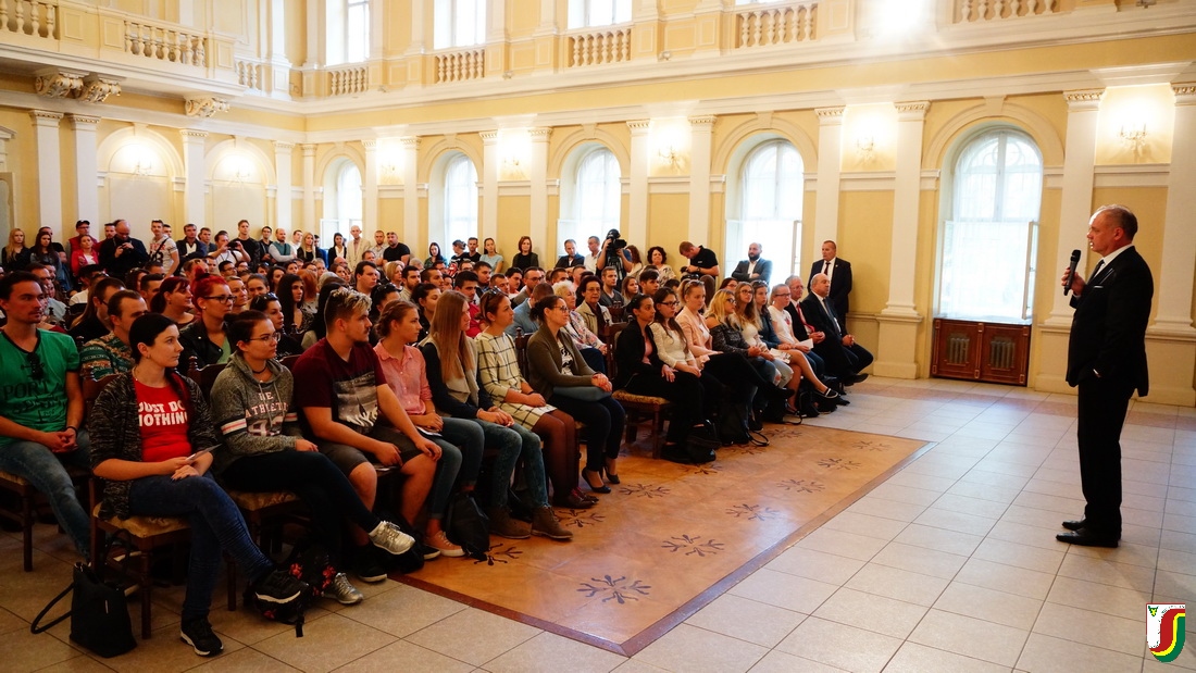Október 10-én a Selye János Egyetemre látogatott Andrej Kiska, a Szlovák Köztársaság elnöke. A Tiszti Pavilon dísztermében intézményünk rektora, Juhász György fogadta az államfőt, aki népes hallgatóság előtt tartott előadást, majd folytatott párbeszédet az érdeklődő közönséggel. Andrej Kiska másodízben látogatott el a Selye János Egyetemre. A látogatás kapcsán örömét fejezte ki, hogy három év után újfent az intézményünk vendége lehet. Jó érzéssel töltötte el, hogy hallgatóink aktívan reagálták az elhangzottakra, kíváncsiak voltak az Amerikai Egyesült Államokról, az Európai Unióról és Szlovákiáról alkotott véleményére. A nemzeti kisebbségekkel kapcsolatban elmondta, véleménye szerint minden embert megillet az anyanyelvi oktatás joga. Örömmel tölti el a Selye János Egyetem léte és az a tudat, hogy „padjait“ sikeres végzősök hagyják el.
