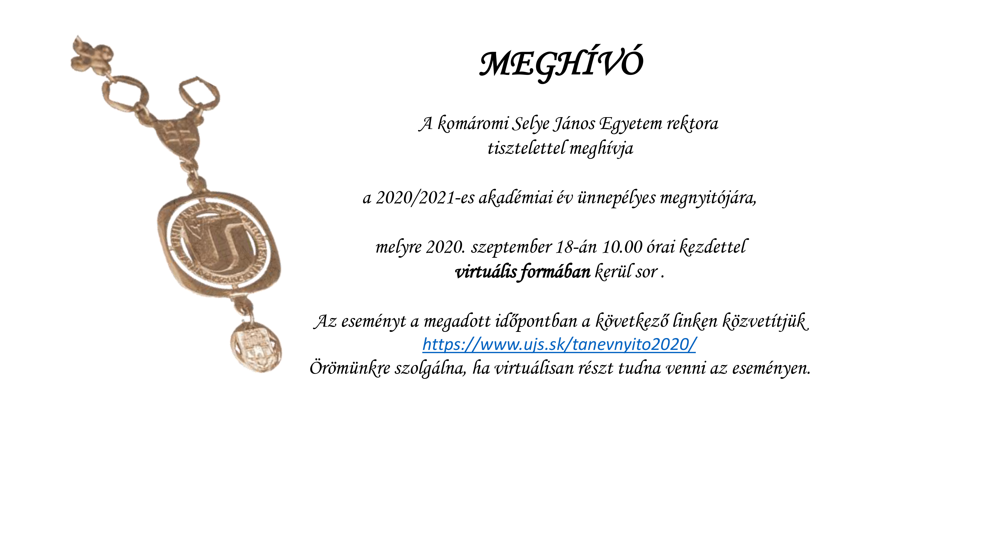 Az SJE rektora tisztelettel meghívja a 2020/21-es akadémiai év ünnepélyes megnyitójára 2020. szeptember 18-án. A megnyitóra virtuális formában kerül sor, a közvetítést 10.00 órai kezdettel az alábbi linken lehet figyelemmel kísérni https://www.ujs.sk/tanevnyito2020/. Örömünkre szolgálna, ha Ön is csatlakozna.