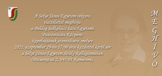 A Selye János Egyetem rektora tisztelettel meghívja a Boldog Salkaházi Sára Egyetemi Pasztorációs Központ kápolnájának szentelésére, melyre 2021. szeptember 29-én 17:00 órai kezdettel kerül sor a Selye János Egyetem Sirály Kollégiumában (Pozsonyi út 2, 945 01 Komárom).