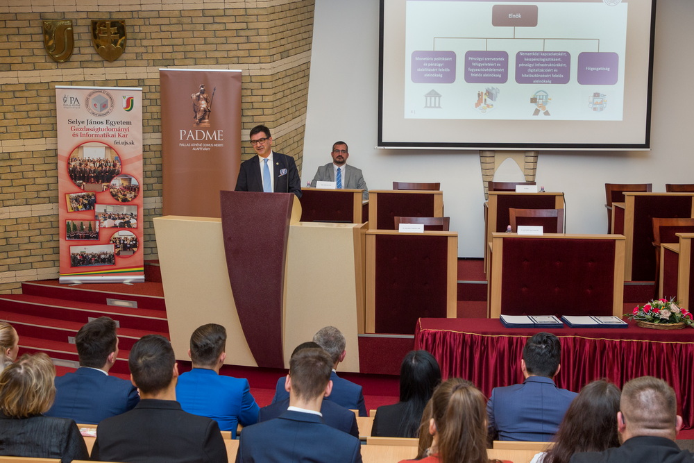 A díjátadó után Lehmann Kristóf, az MNB nemzetközi monetáris politikai és gazdaságtudományi ismeretterjesztési igazgatójának és Sándor Márk, az MNB humánerőforrás-menedzsment igazgatójának előadását hallhatták a megjelentek. A hallgatók nevében Balázs Klaudia, az SJE GIK Közgazdaságtan és menedzsment tanulmányi programjának mesterszakos hallgatója köszönte meg a lehetőséget, melyet az ösztöndíj jelent. Az ösztöndíjprogramot a Pallas Athéné Domus Meriti Alapítvány támogatja.