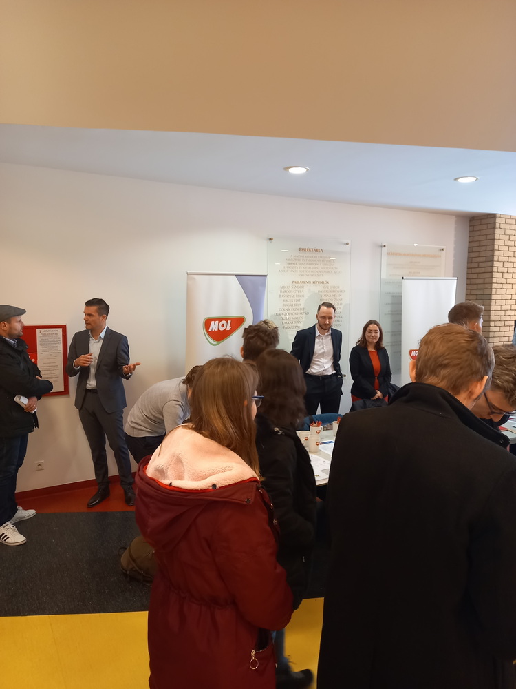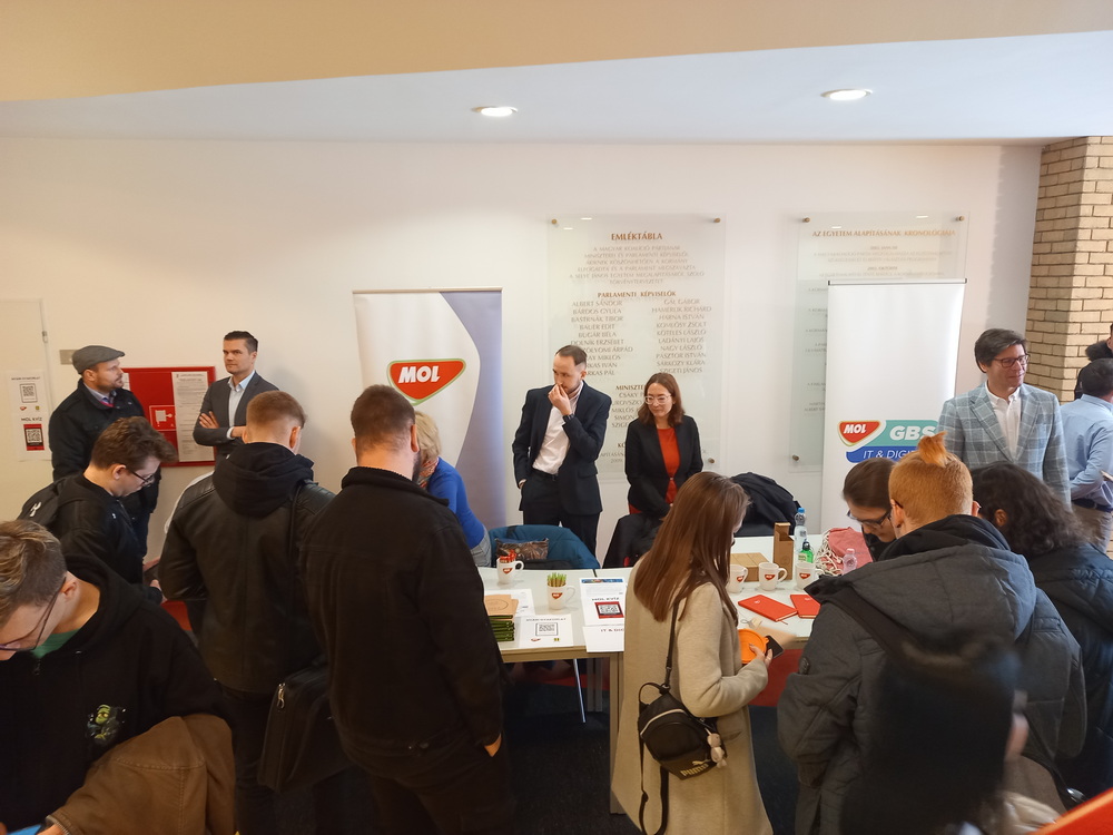 A MOL GBS Üzleti Szolgáltatások jelen lévő csapata részletezte, hogy milyen szerteágazó IT vagy éppen közgazdasági vonalon van lehetőség szakmai gyakorlatot végezni a vállalatnál. A szakmai gyakorlattal kapcsolatos további részleteket tudhattak meg a hallgatók az előadást követően a MOL standon, ahol további MOL-os szakértőkkel is találkozhattak, beszélgethettek.