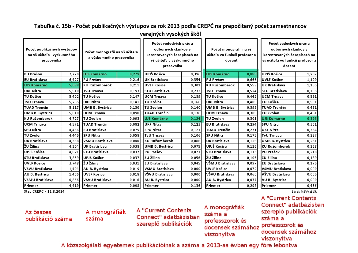 Vláda Slovenskej republiky dňa 17. septembra 2014 prerokovala Výročnú správu o stave vysokého školstva za rok 2013. Súčasťou správy je aj Výkaz o publikačnej činnosti verejných vysokých škôl, kde v počte publikačných výstupov na prepočítaný počet zamestnancov verejných vysokých škôl sa UJS umiestnila na poprednom mieste.