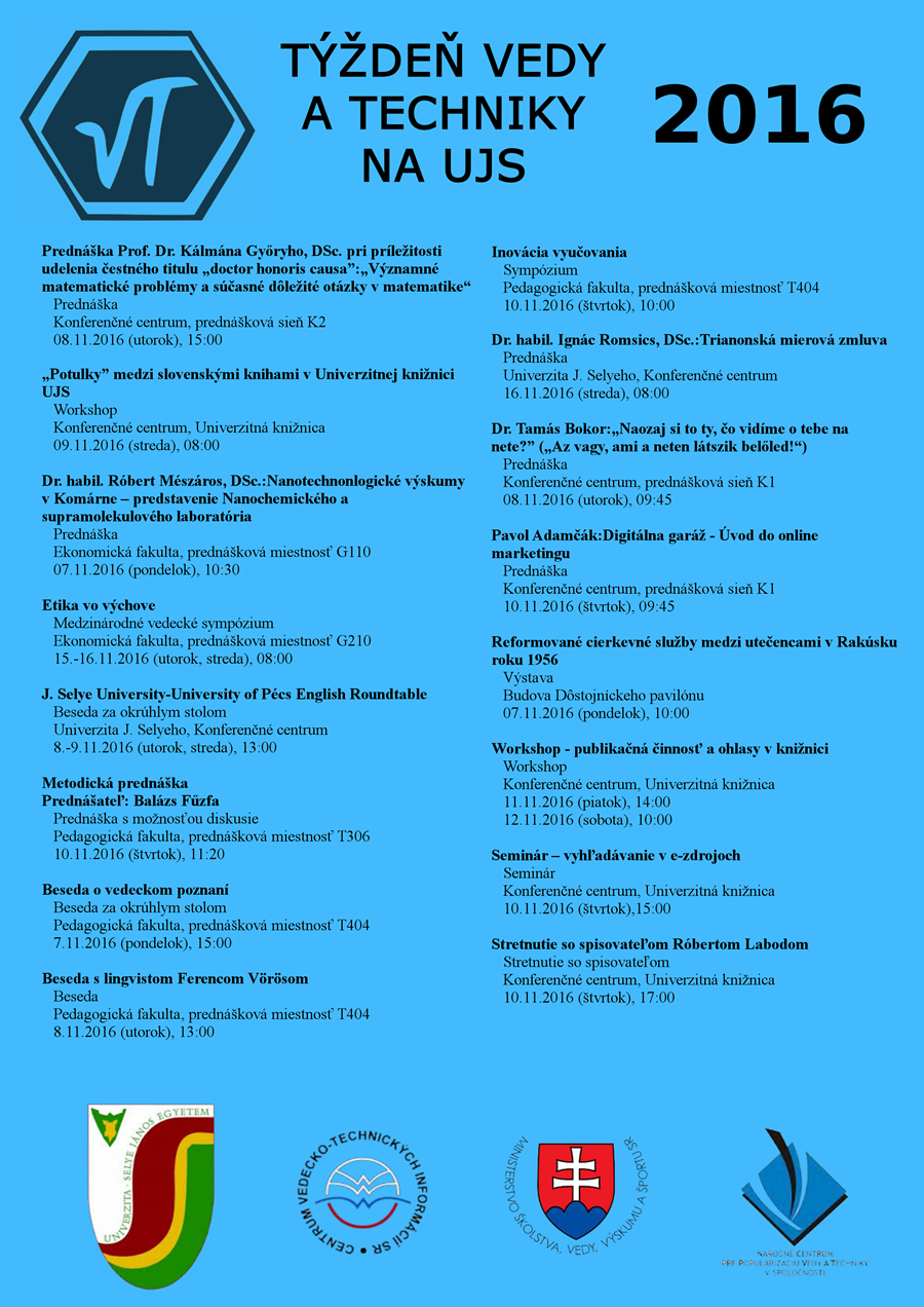 Informácie o podujatiach v celej SR v rámci Týždňa vedy nájdete na stránke: www.tyzdenvedy.sk. Univerzita J. Selyeho sa každoročne zapája svojimi sprievodnými podujatiami do týždňa vedy a techniky. Tohtoročné sprievodné podujatia na Univerzite J. Selyeho sú dostupné tu.